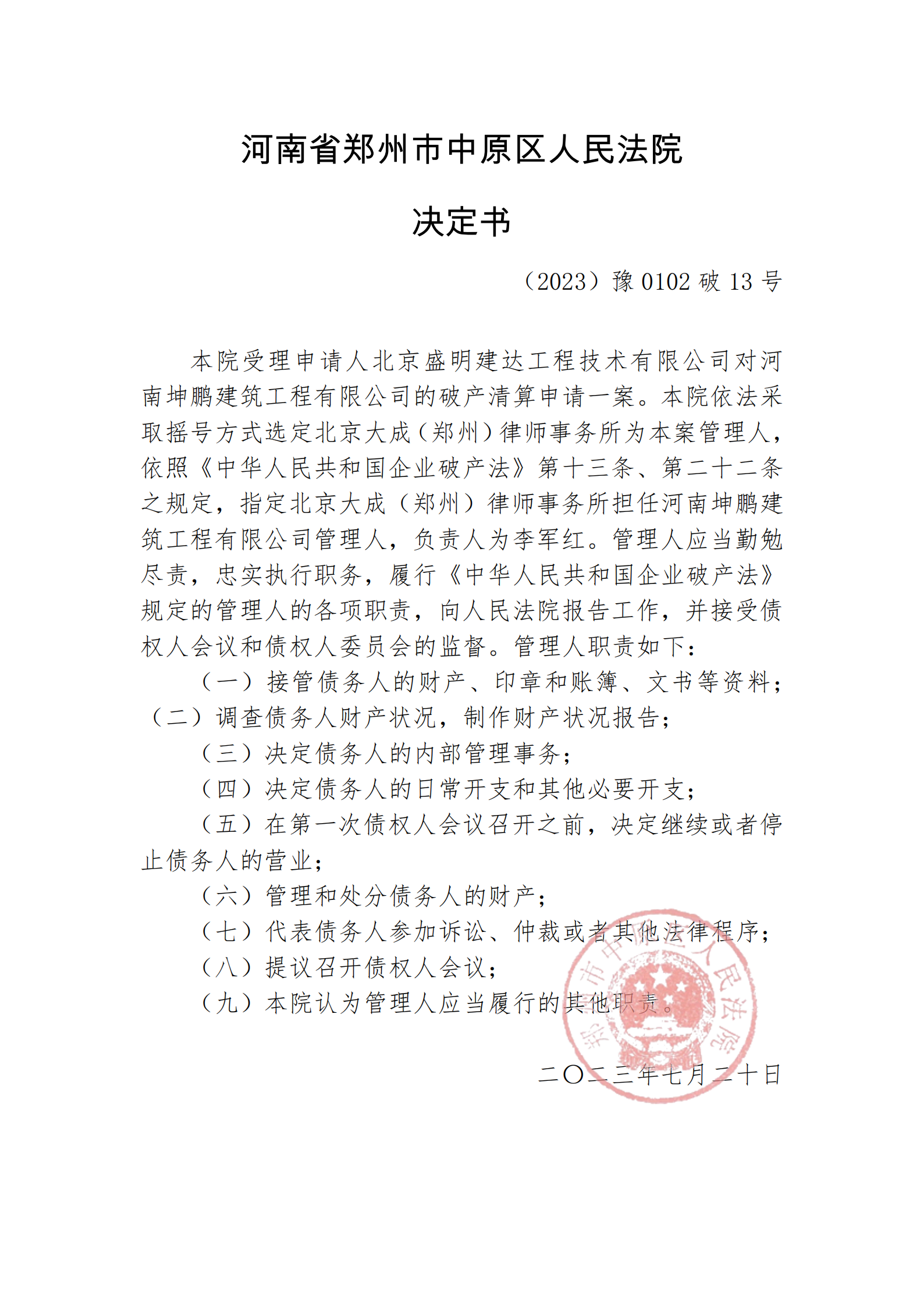 河南省郑州市中原区人民法院决定书