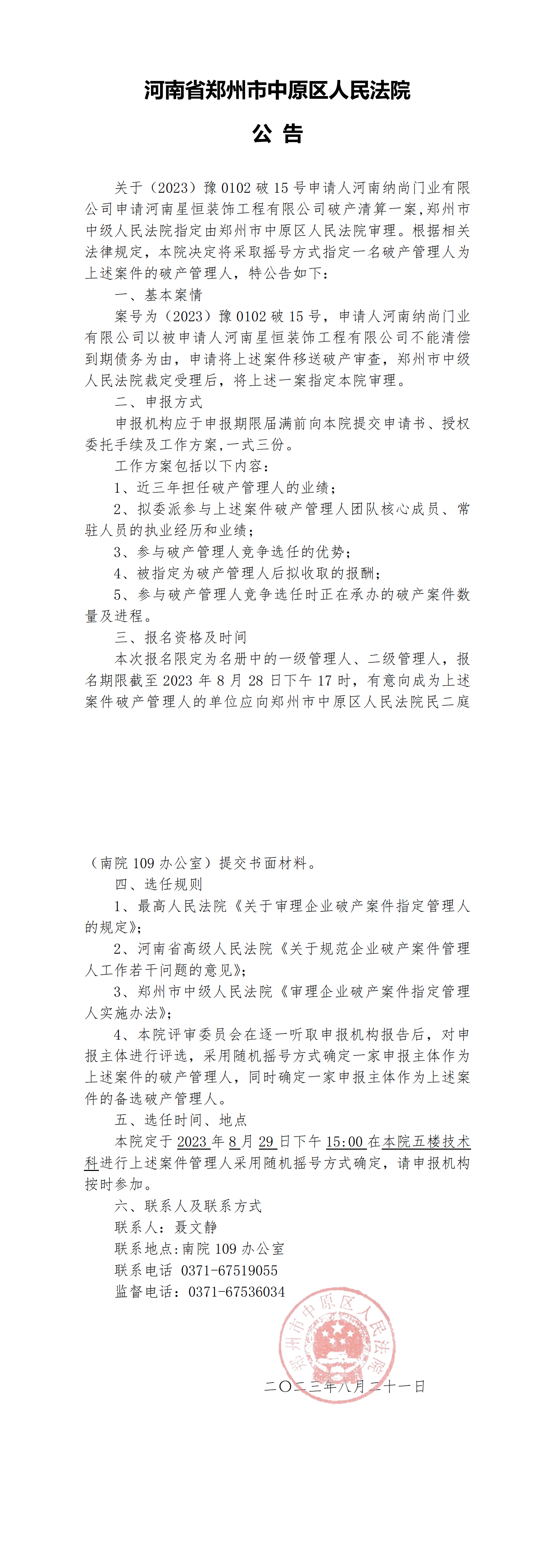 河南省郑州市中原区人民法院公告