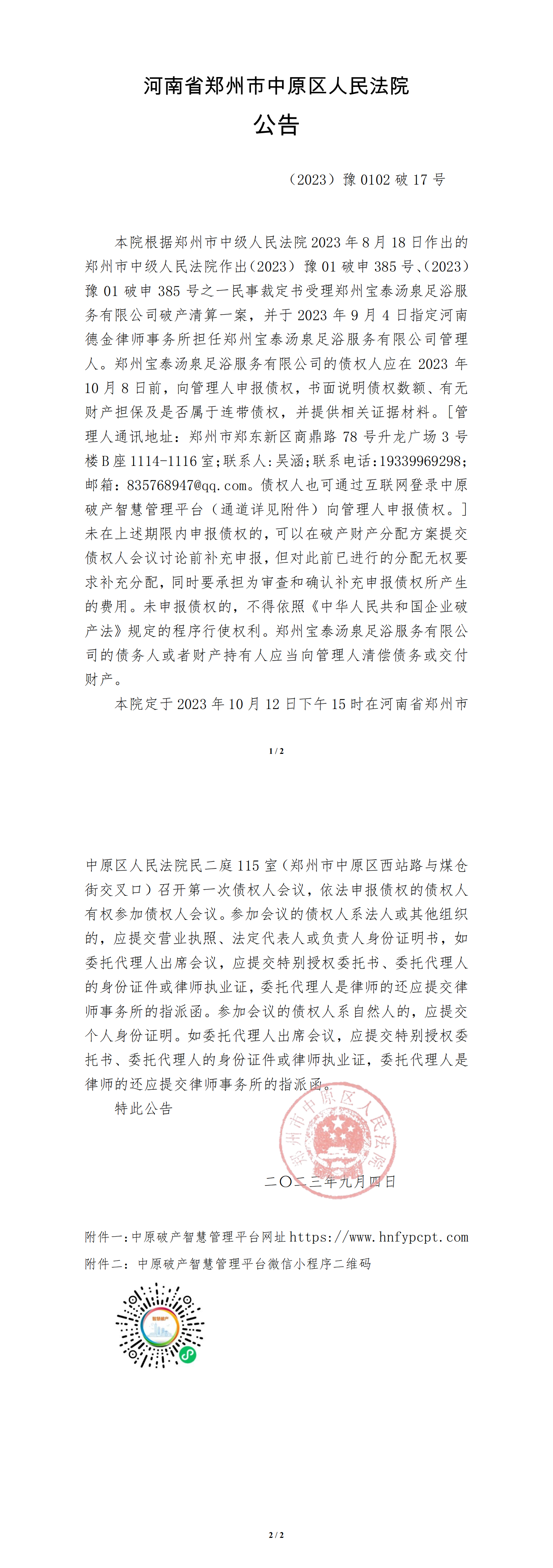 河南省郑州市中原区人民法院公告
