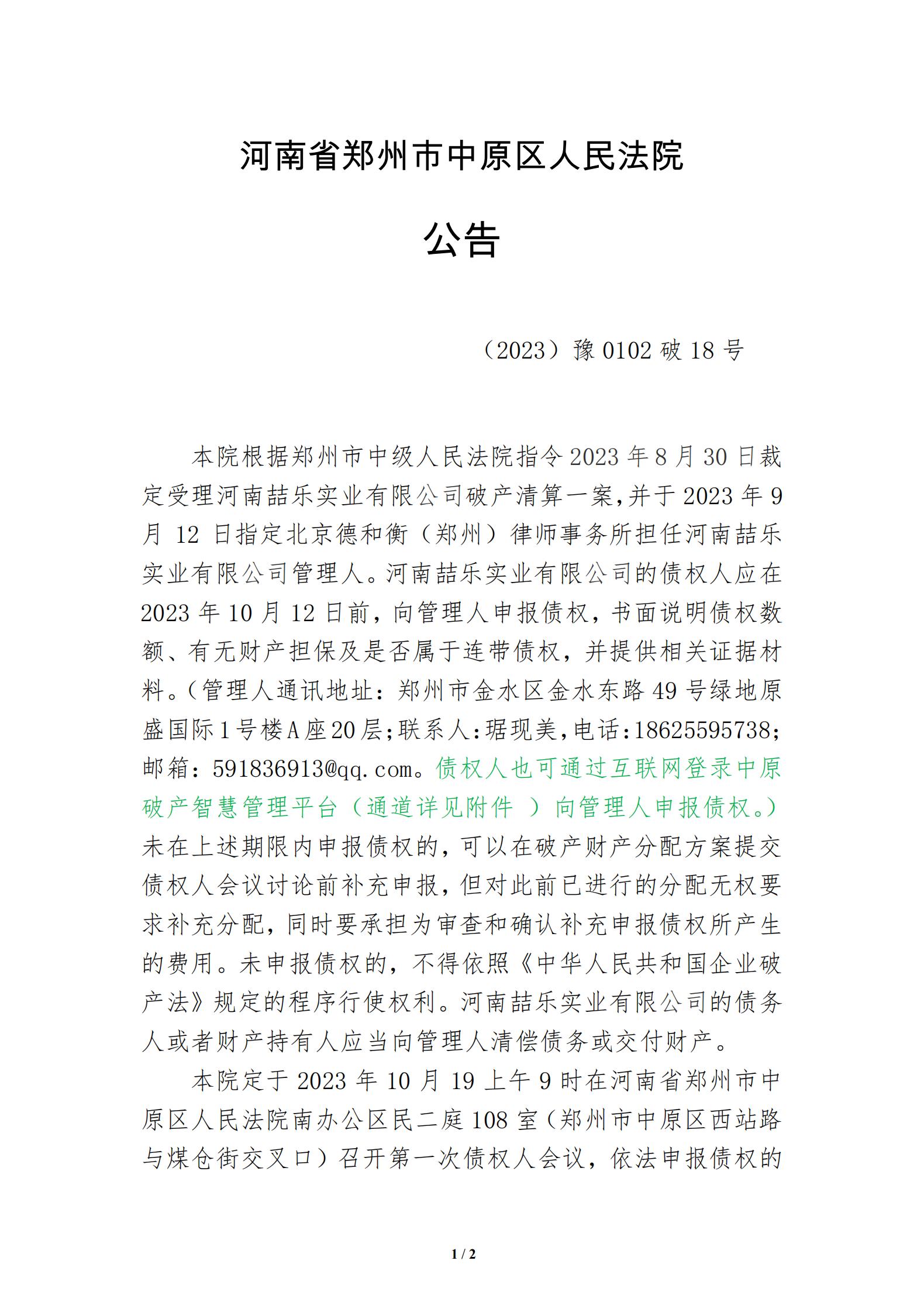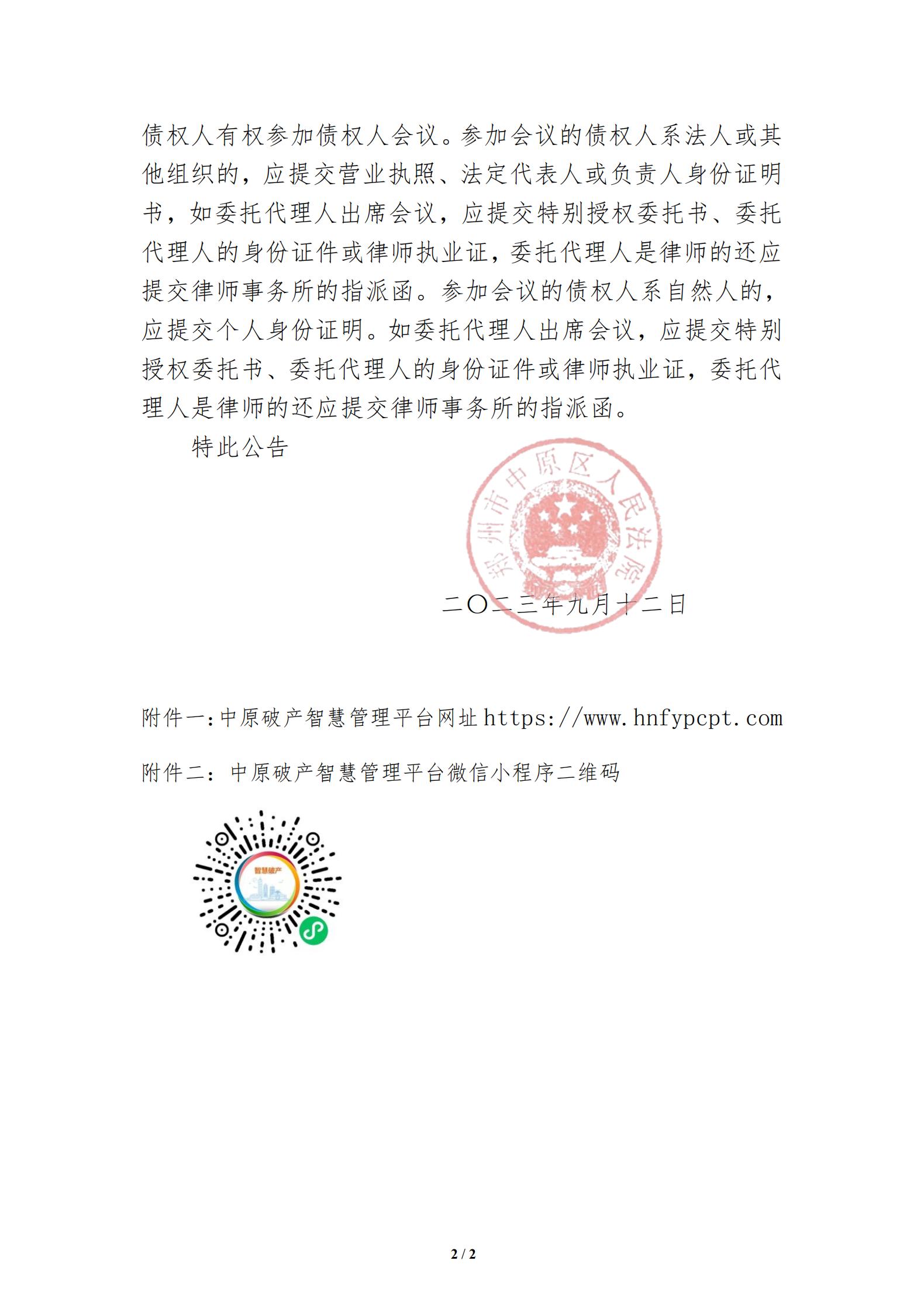 河南省郑州市中原区人民法院公告