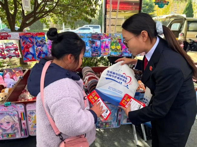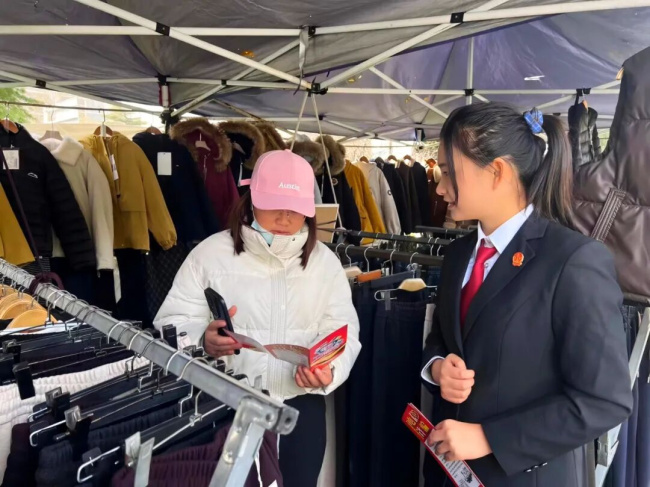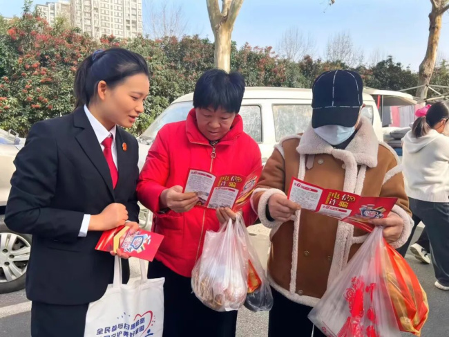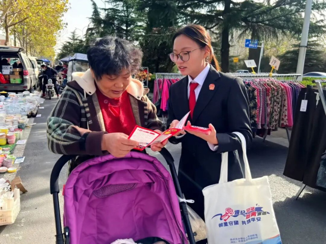 没有固定的宣传摊位,普法现场就是整个集会。志愿者们手持宪法宣传彩页、防范电信网络诈骗指南等丰富的法治宣传资料,化身“移动普法站”,主动走进人群。她们利用群众驻足、休息、购物的间隙,见缝插针地发放资料,并结合常见法律问题和当前社会热点,用通俗语言进行讲解,实现普法宣传与基层群众“零距离”接触。