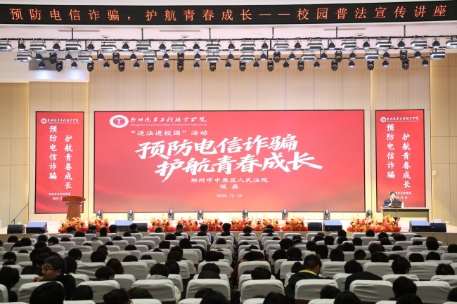 为进一步提升在校学生防范电信网络诈骗的意识和能力,营造安全、法治、文明的校园环境,12月10日下午,郑州市中原区人民法院法官助理侯磊走进郑州汽车工程职业学院,开展以“预防电信诈骗 护航青春成长”为主题的法治宣讲活动。来自郑州汽车工程职业学院、郑州市财经学校、郑州轻工业学校的550余名师生齐聚一堂,共同聆听这堂“防诈”法治课。